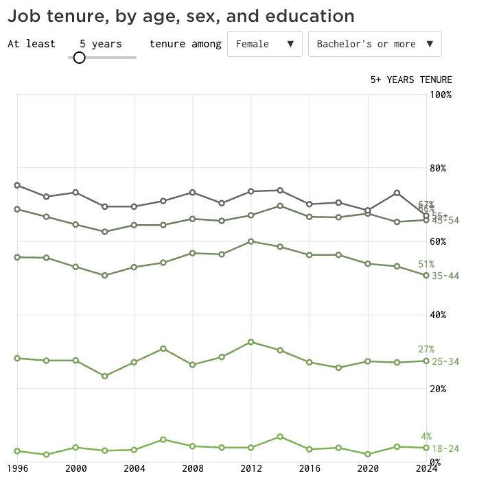 Flowing Data breaks down the data across two interactive graphs. The first graph shows how long people worked the same job from 1996-2024.