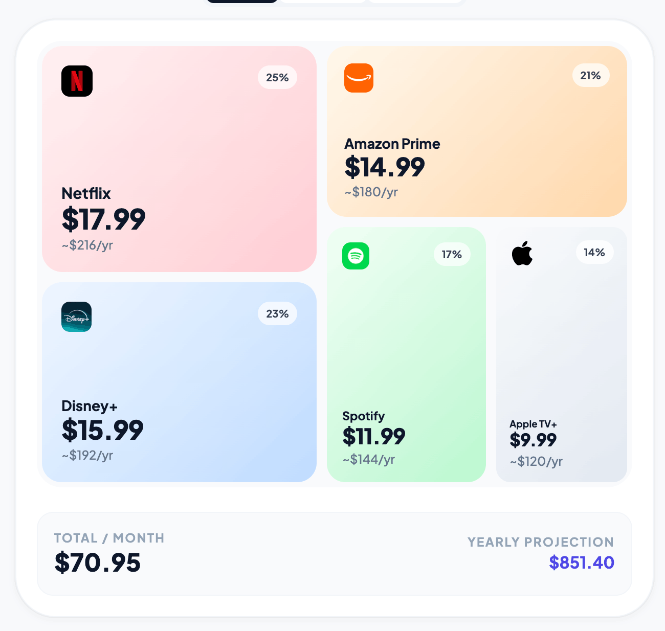 This Subscription Cost Visualizer easily lets you add up all of your subscriptions and see how much they cost you per month and per year. Plus, you can visualize the outcome in various ways to see which are the least and most expensive.