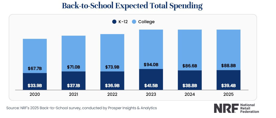 "College students and their families are planning to spend an average of $1,325.85, down from $1,364.75 in 2024. Although per person spending has decreased, on average, more consumers are shopping across almost every category, bringing expected total back-to-college spending to $88.8 billion, up from $86.6 billion last year.