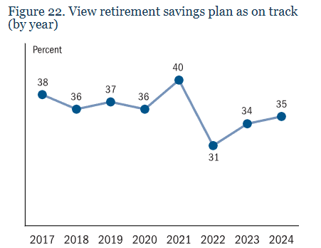 "While most non-retired adults had some type of tax-preferred retirement account (such as a 401(k), IRA, or Roth IRA) or a defined benefit pension, a lower 35 percent of non-retirees thought their retirement saving was on track. The share of non-retirees who thought their retirement saving was on track was up relative to 2022 and 2023 but below the shares who thought their saving was on track in 2021."