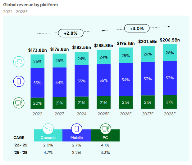 "The global games market is estimated to reach $188.8 billion in 2025, a 3.4% increase year-on-year according to Newzoo's latest report. Console revenues are predicted to lead this growth, with the segment forecast to rise 5.5% to $45.9 billion. Newzoo cites the launch of the Nintendo Switch 2 as the main driver, as well as "higher software prices and major releases". Mobile is set to maintain the largest share of overall revenues, and is projected to generate $103 billion."