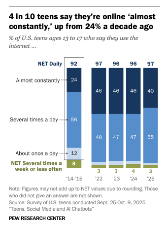"Nearly all U.S. teens (97%) say they use the internet daily, including four-in-ten who say they are almost constantly online."